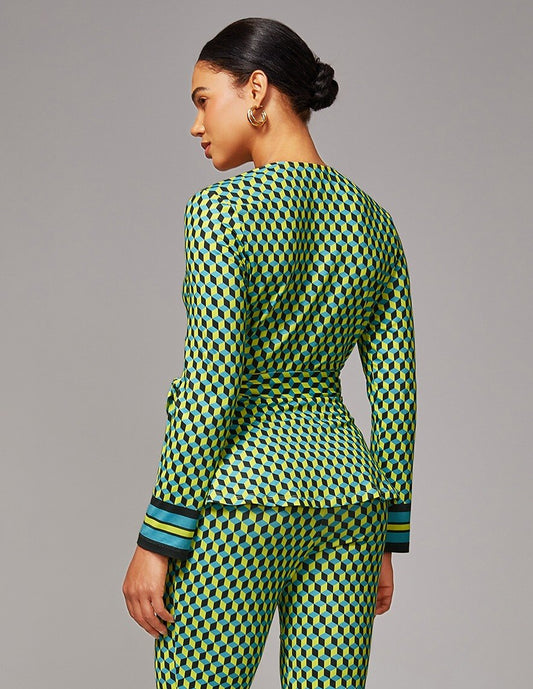 Green Geometric Print Stretchy Wrap Satin Top