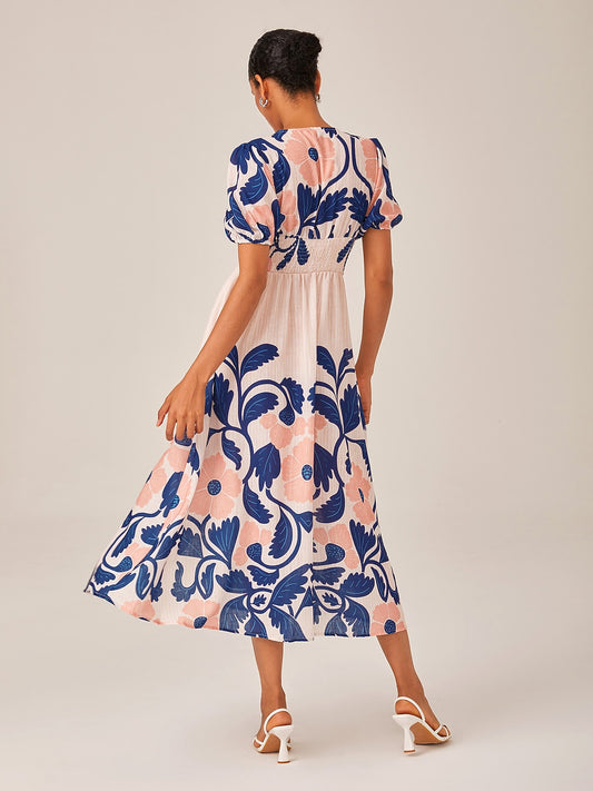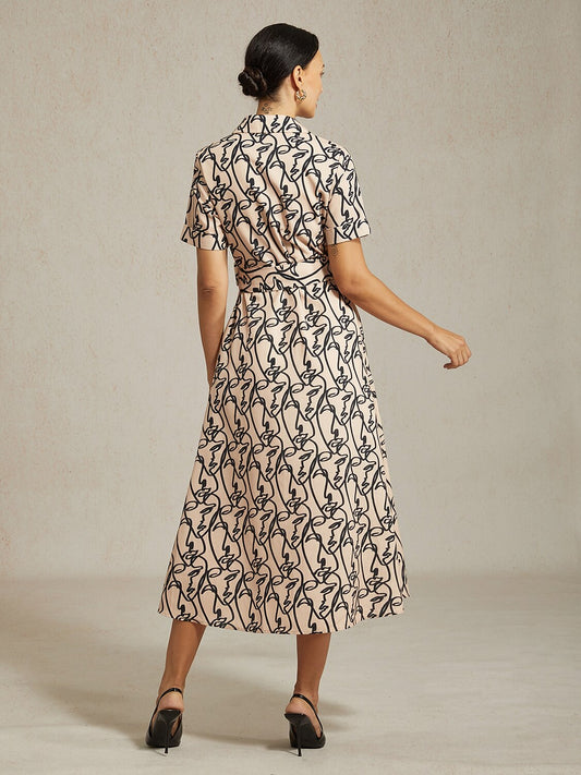 Abstract art print Linen-Like Fabric Waist-Cinching Maxi Dress