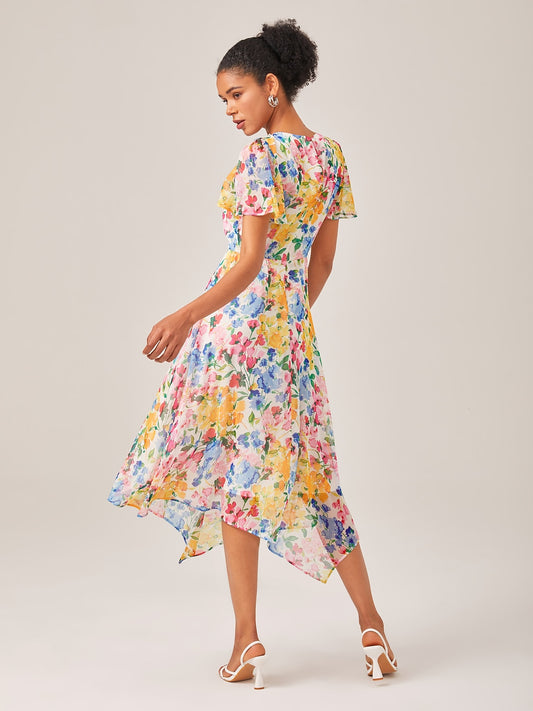 • Chiffon Floral Print A-Line Short Sleeve Dress
