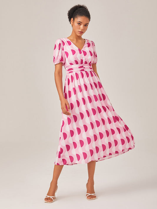 Pink Polka Dot Geometric Print Cinched Waist Dress
