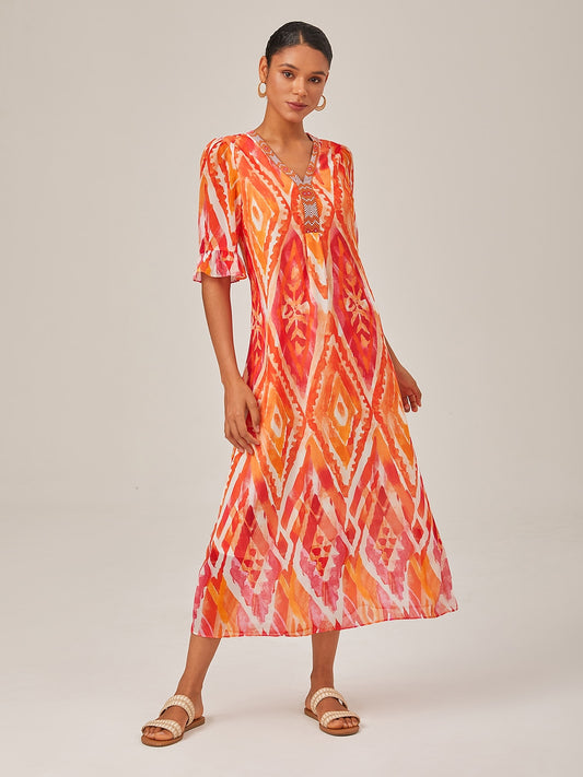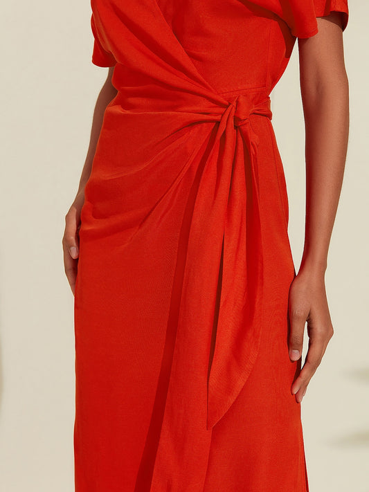 Tencel Linen Orange Red Shirred Wrap Midi Dress