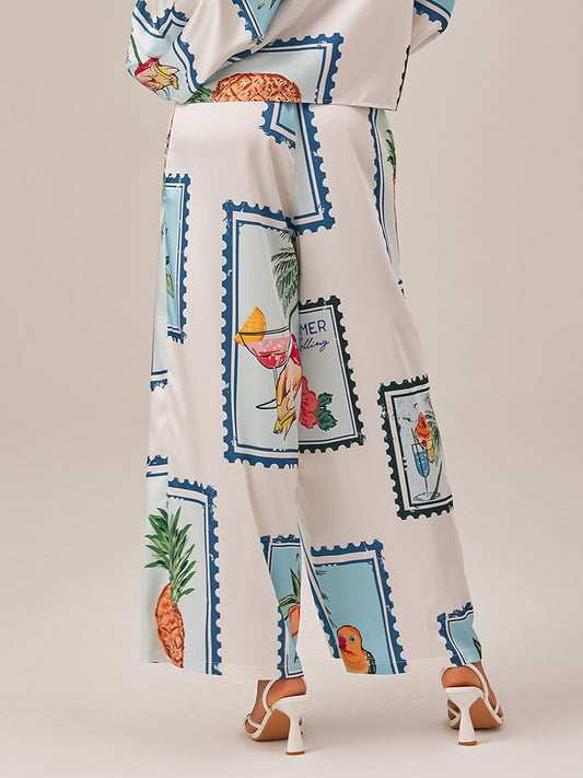 Satin Casual Seamless Pattern Print Elastic Waist Wide Leg Pants