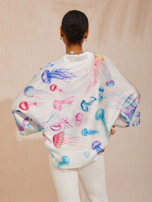 Vacation Jellyfish Motif Batwing Sleeve Satin Shirt