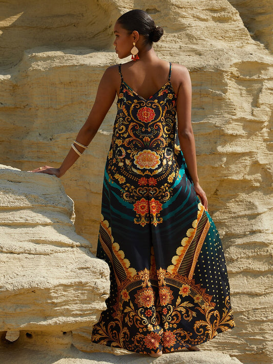 Sunset Bloom Reverie Silky Satin Floral Maxi Dress