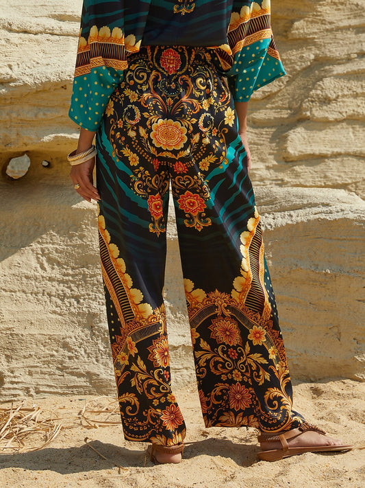 Mallorca Blossom Silky Satin Elastic Waist Wide-Leg Pants