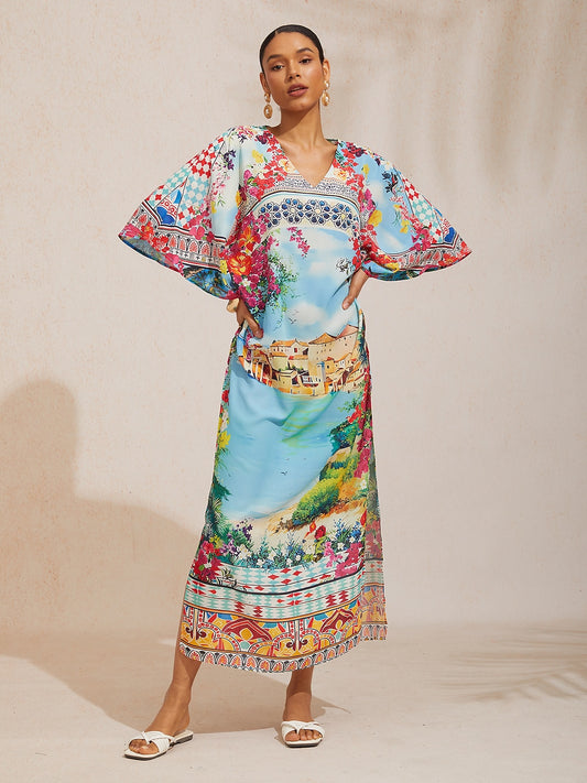 Mallorca Blossom Flowy Chiffon Dolman Sleeve Maxi Dress