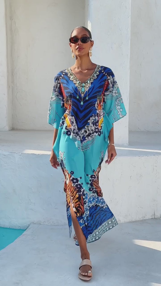 Vacation Tiger Floral Motif Batwing Sleeve Slit Chiffon Maxi Dress