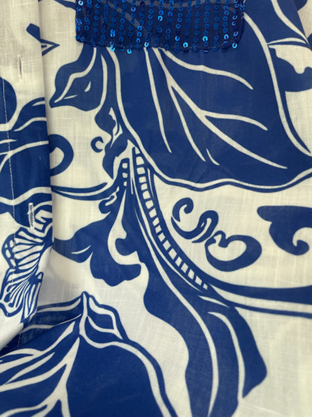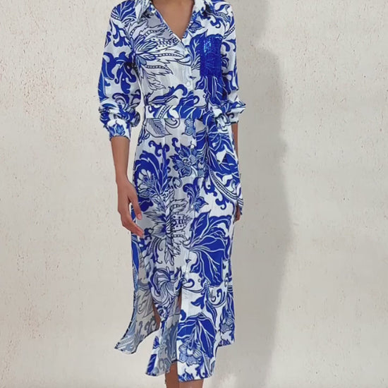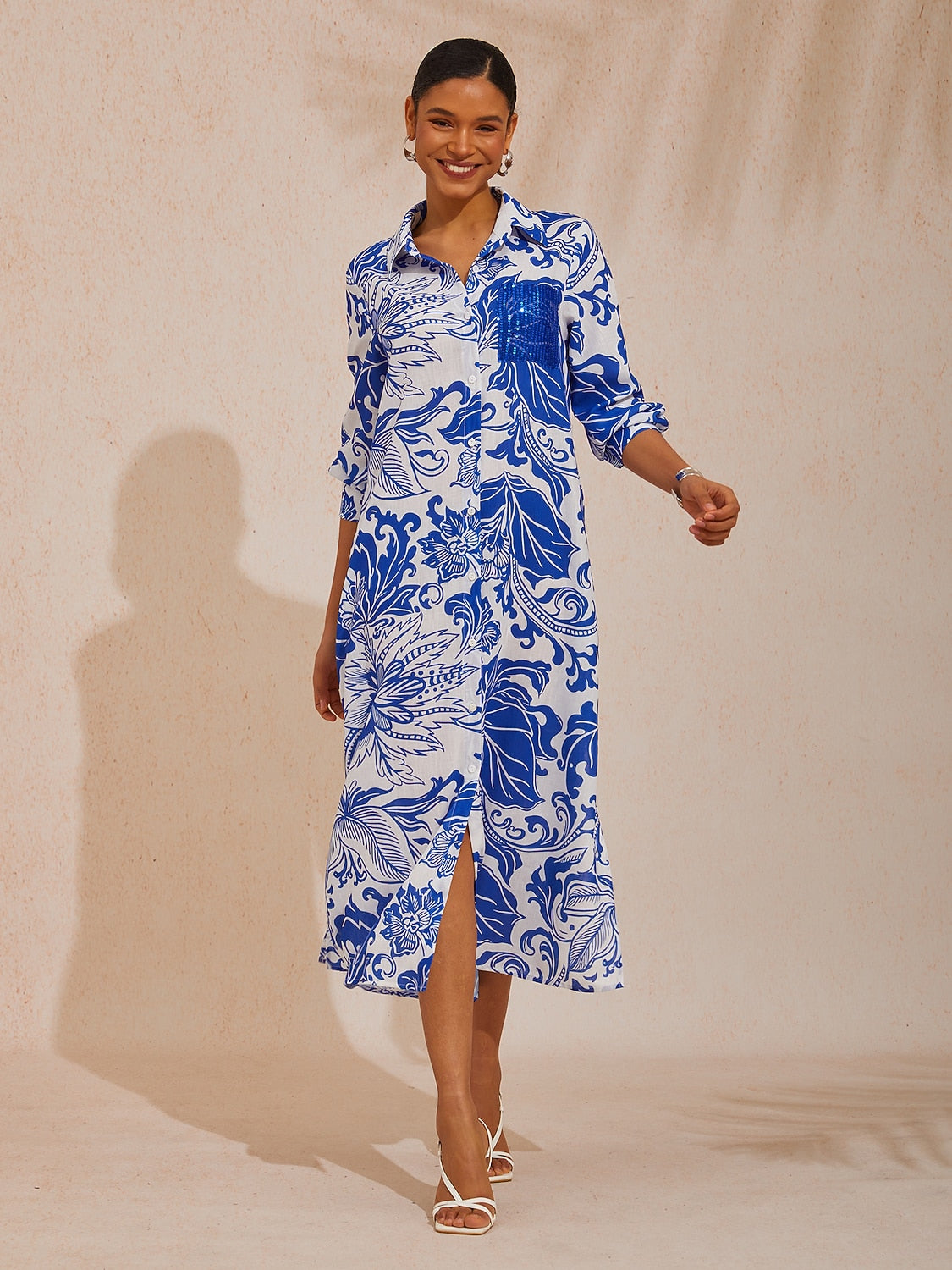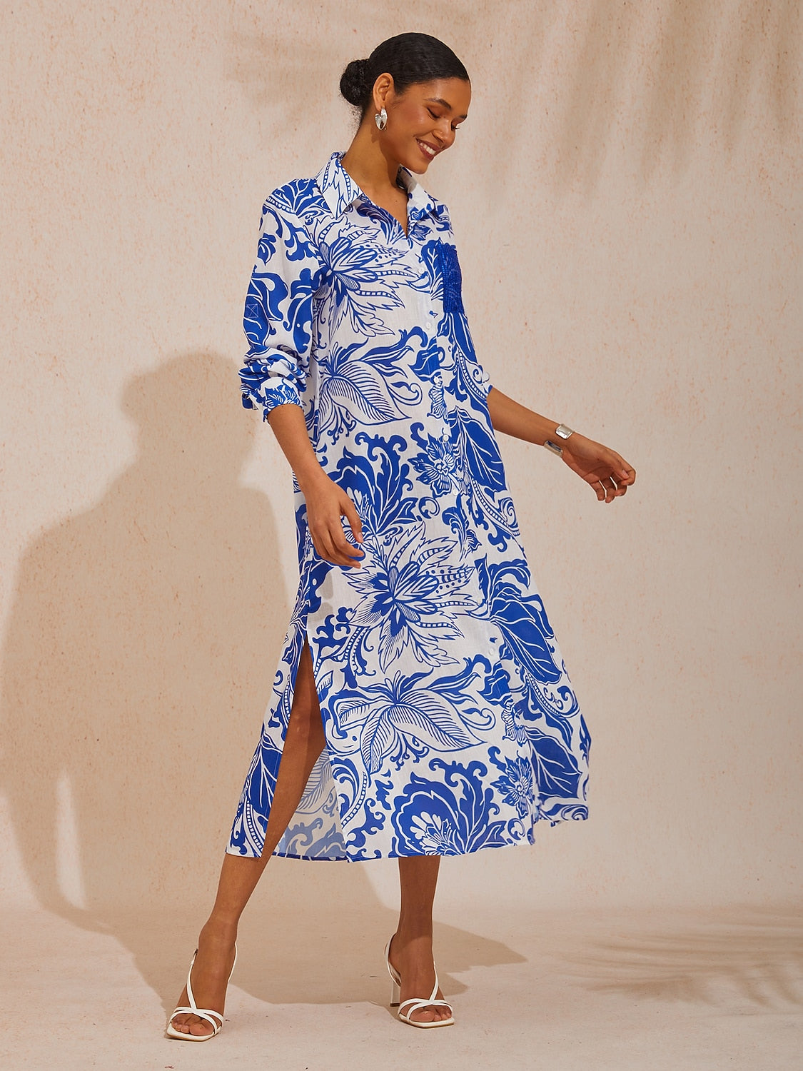 Vacation Blue Floral Straight Linen-Like Shirt Dress