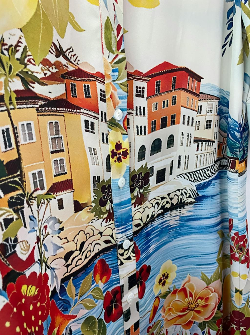 Vacation Scenic Floral Print Straight Satin Shirt Dress