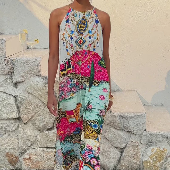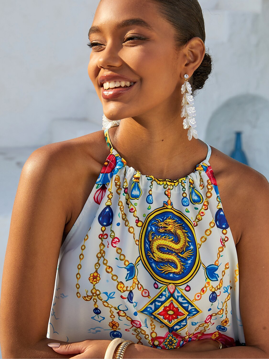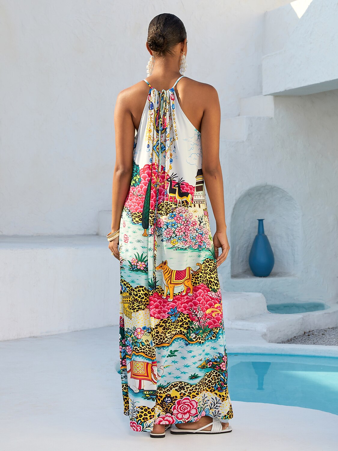 Vacation Vintage Patchwork Motif Sleeveless Drawstring Satin Maxi Dress