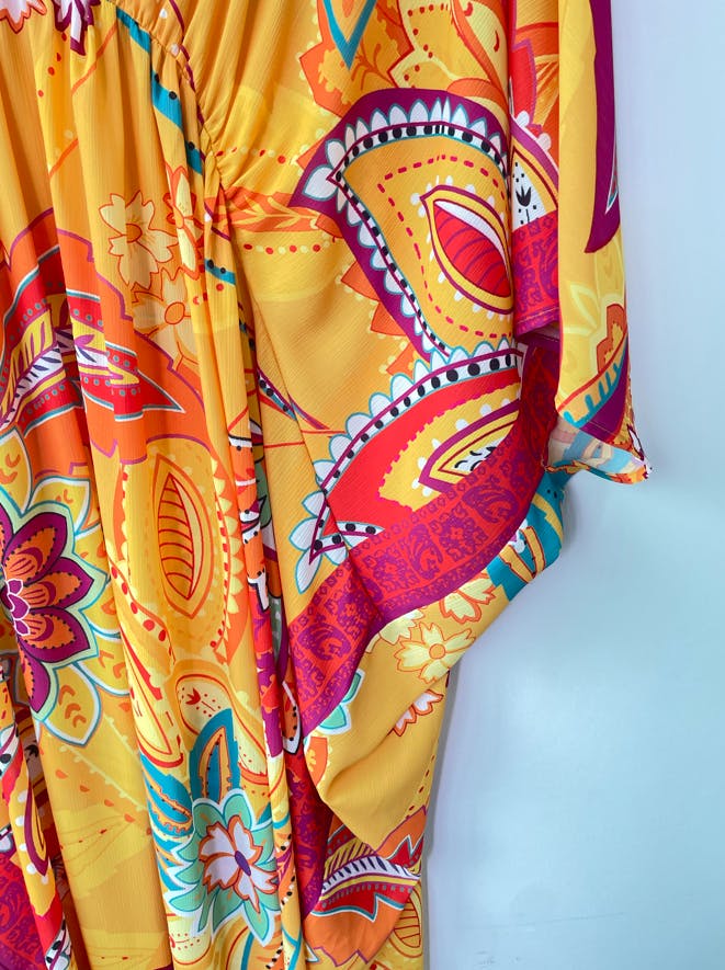 This chiffon maxi dress features a vibrant yellow paisley floral print with dolman sleeves, offering a flowy, relaxed fit that’s perfect for a stylish and comfortable vacation look.