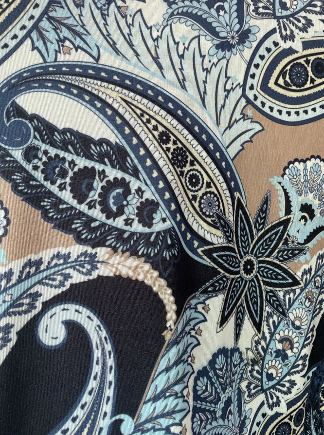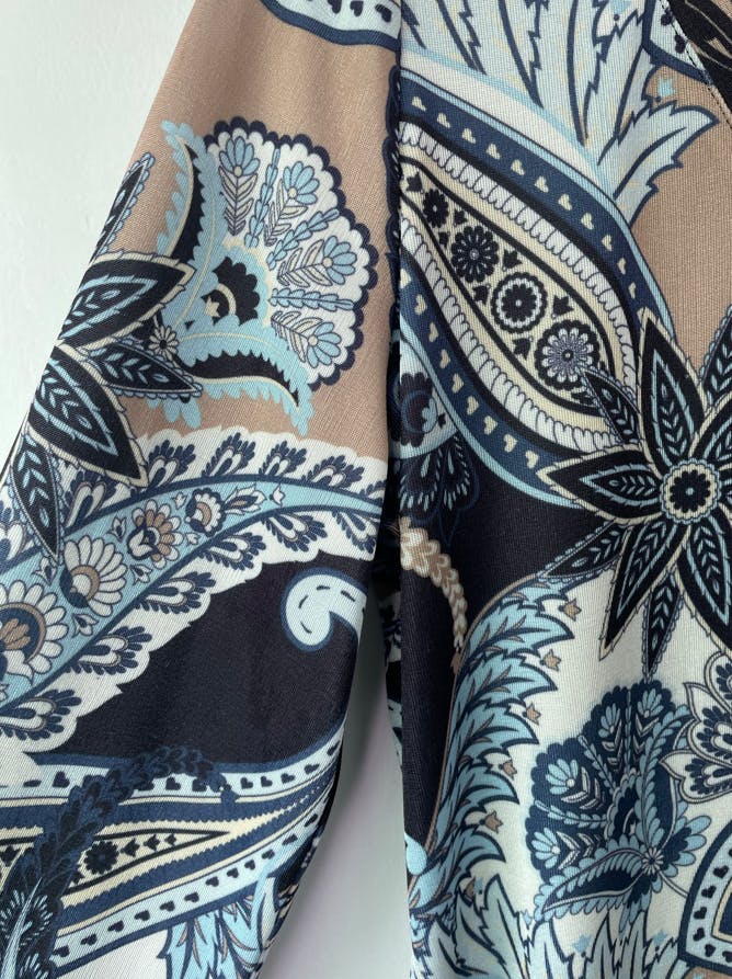 This Knit Stretch Fitted Paisley Print Maxi Dress offers a flattering, figure-hugging fit with a vibrant paisley design, perfect for a stylish and comfortable look on vacation or warm-weather outings.