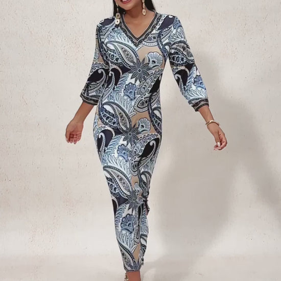 Knit Stretch Fitted Paisley Print Maxi Dress Vacation