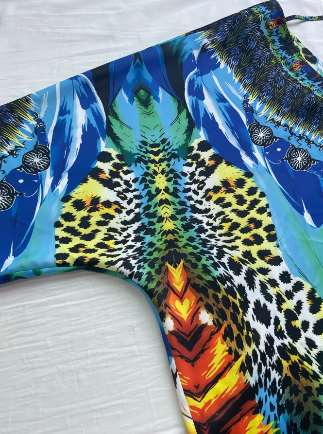 This satin top features a stylish feather leopard motif and dolman sleeves, offering a relaxed fit with a touch of luxury, perfect for adding bold flair to your vacation wardrobe.