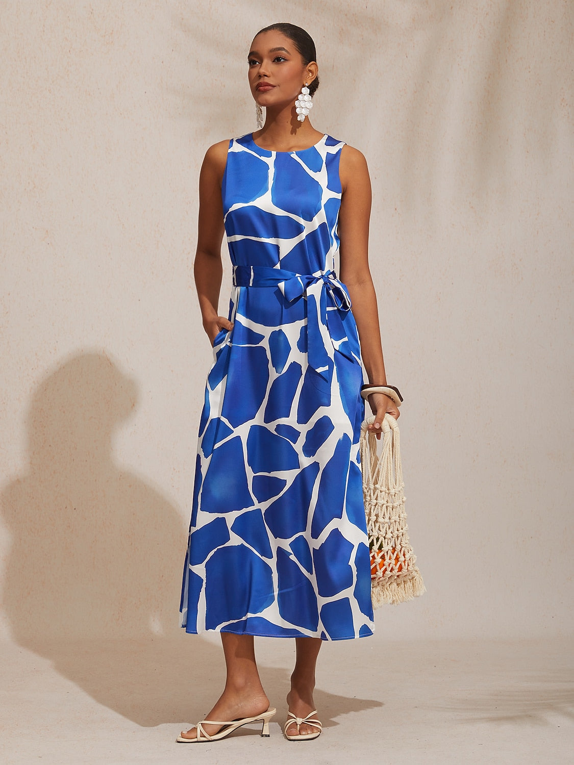 Vacation Geometric Color Block Print Straight Fit Satin Maxi Dress