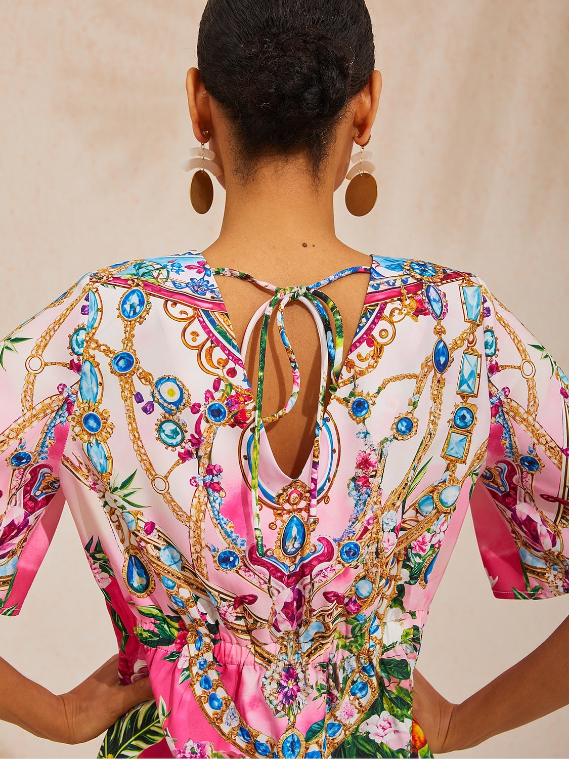 Vacation Floral Chain Print Dolman Sleeve Chiffon Maxi Dress