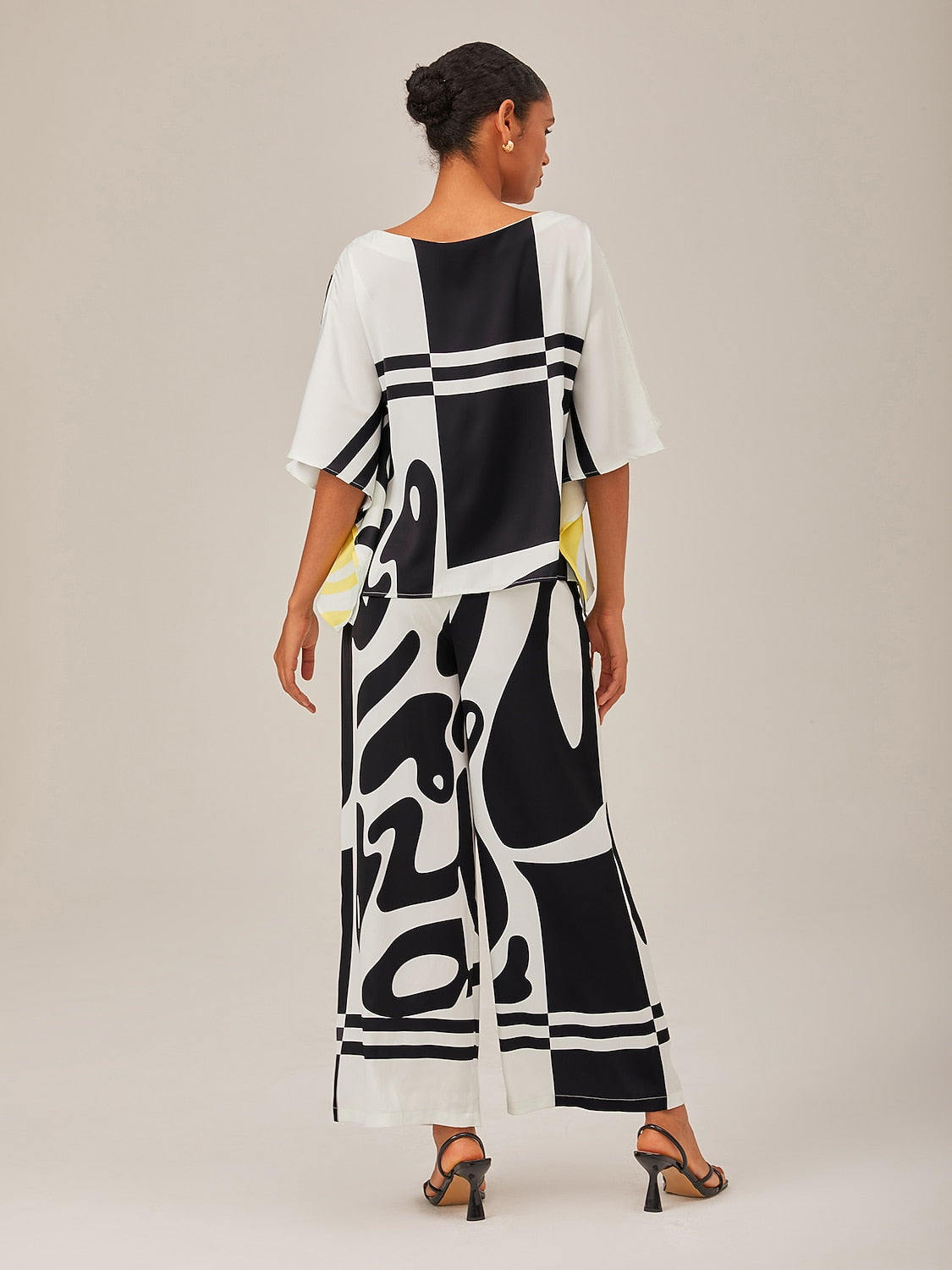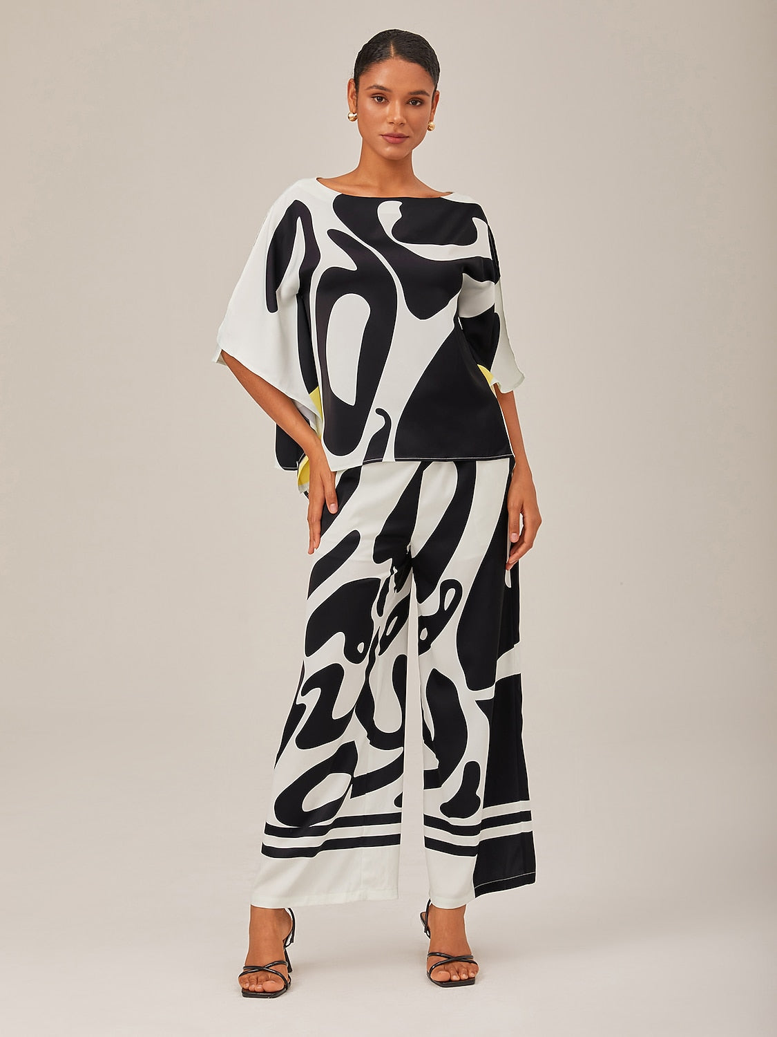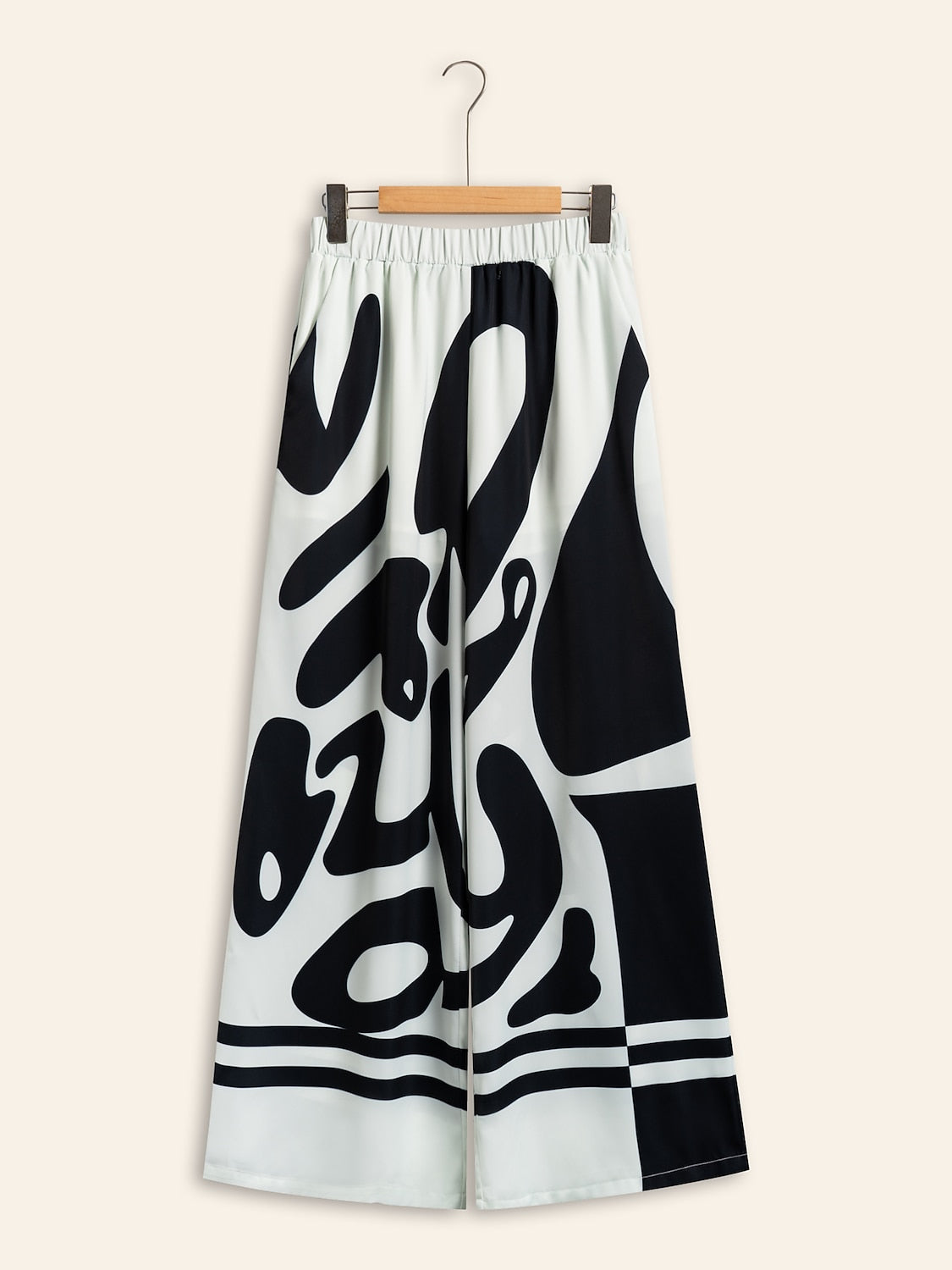 Crafted from satin with bold geometric prints, these pants feature a relaxed straight silhouette and elasticated details for comfort, delivering a vibrant, artistic look. Perfect for embracing a modern-bohemian style at resort getaways, casual gatherings, or adding a striking graphic touch to your wardrobe.
