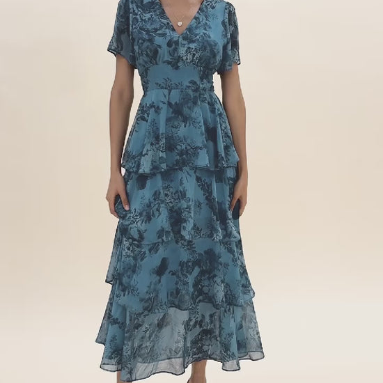 Chiffon Floral Print A-Line Tiered Ruffle Cake Maxi Dress