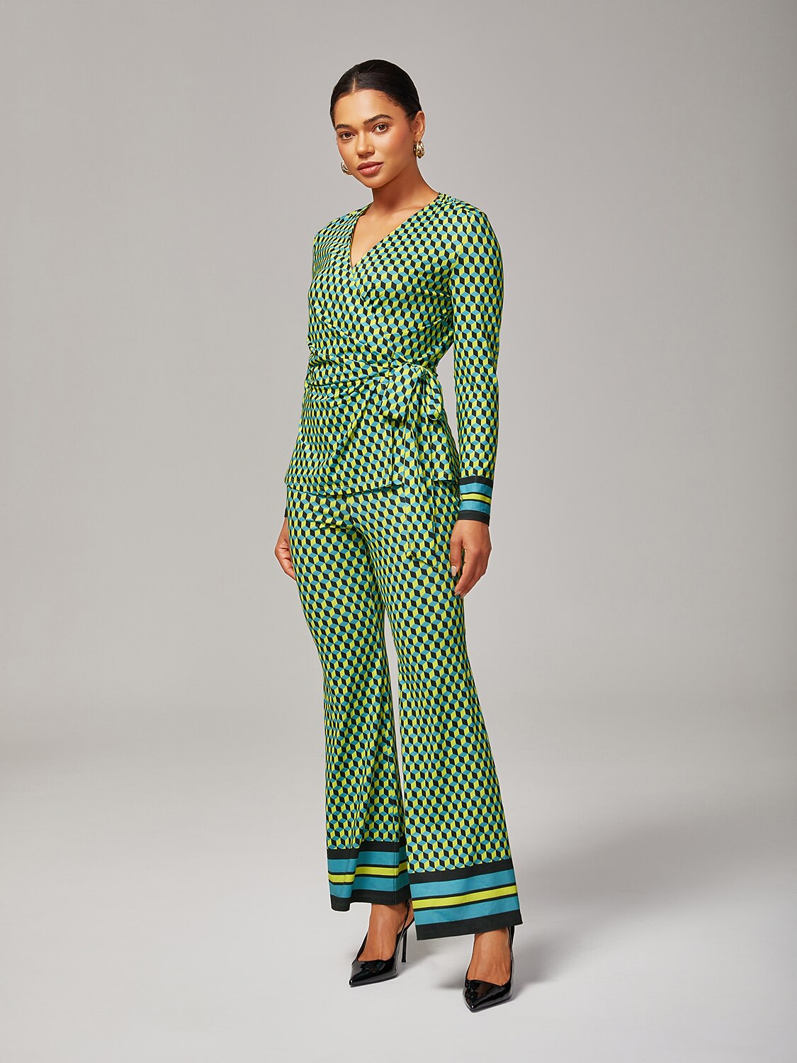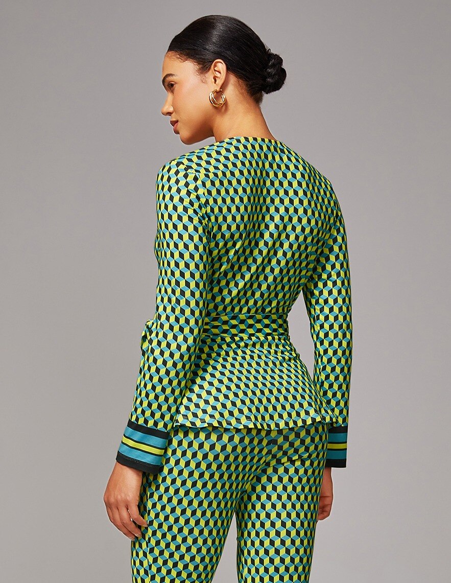 This green geometric print satin top features a stretchy wrap design, offering a flattering fit, elegant drape, and comfortable wear, perfect for chic everyday outfits or stylish evening ensembles.