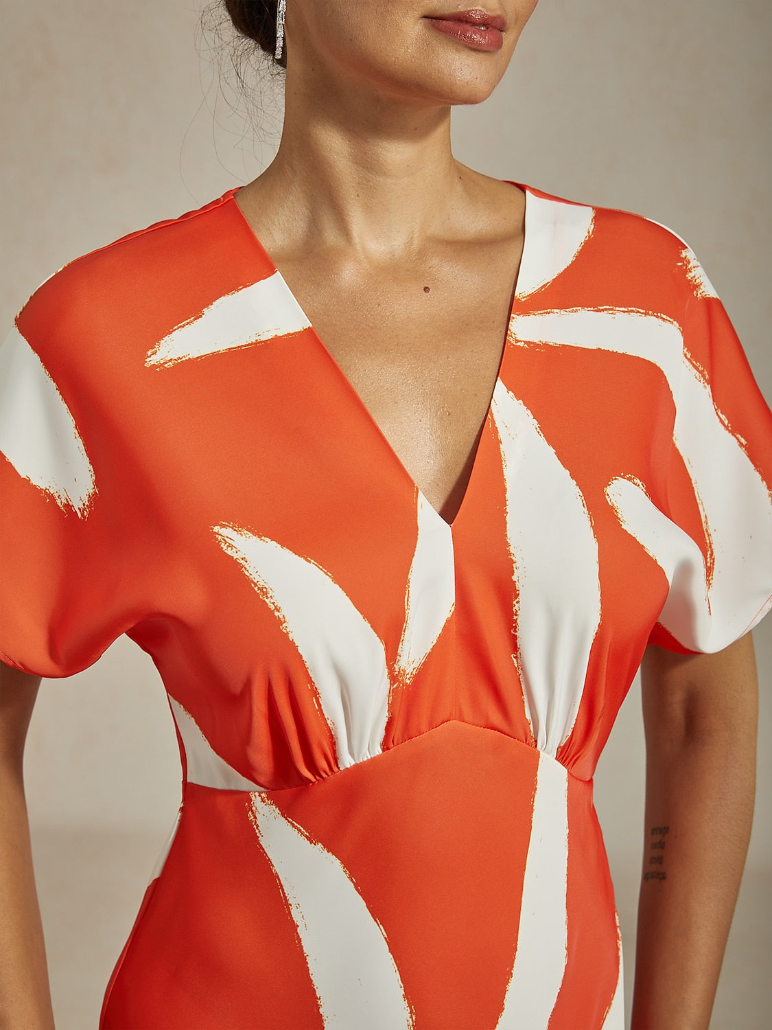 Tencel Linen Orange Red Shirred Wrap Midi Dress