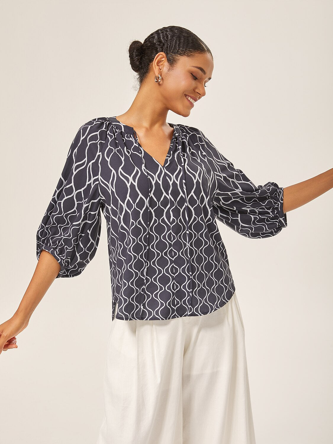 Featuring sleek monochrome prints and playful lantern sleeves, this top balances retro charm and modern style, perfect for effortless daytime-to-evening styling.