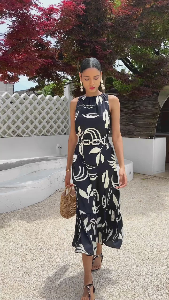 Satin Leaves Print Sleeveless Maxi Dress (No Belt)