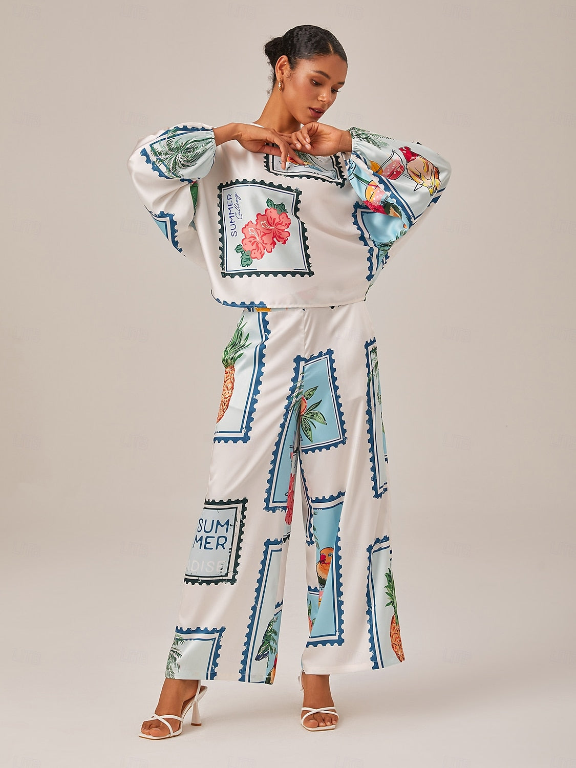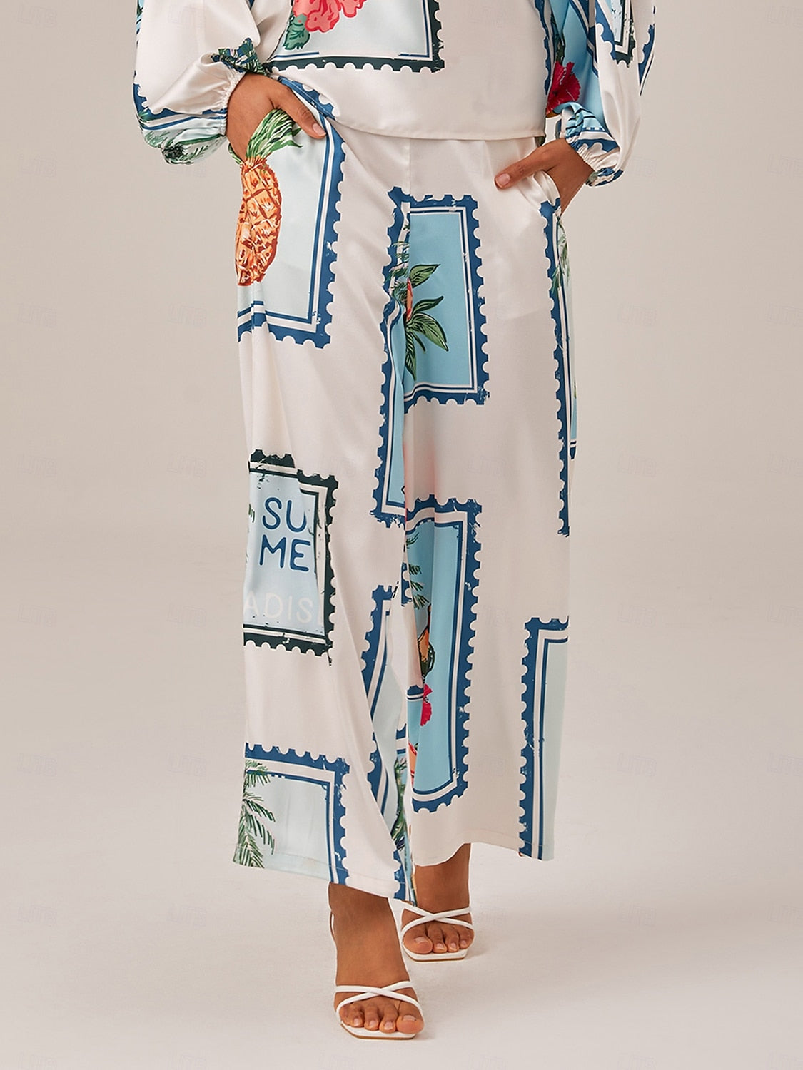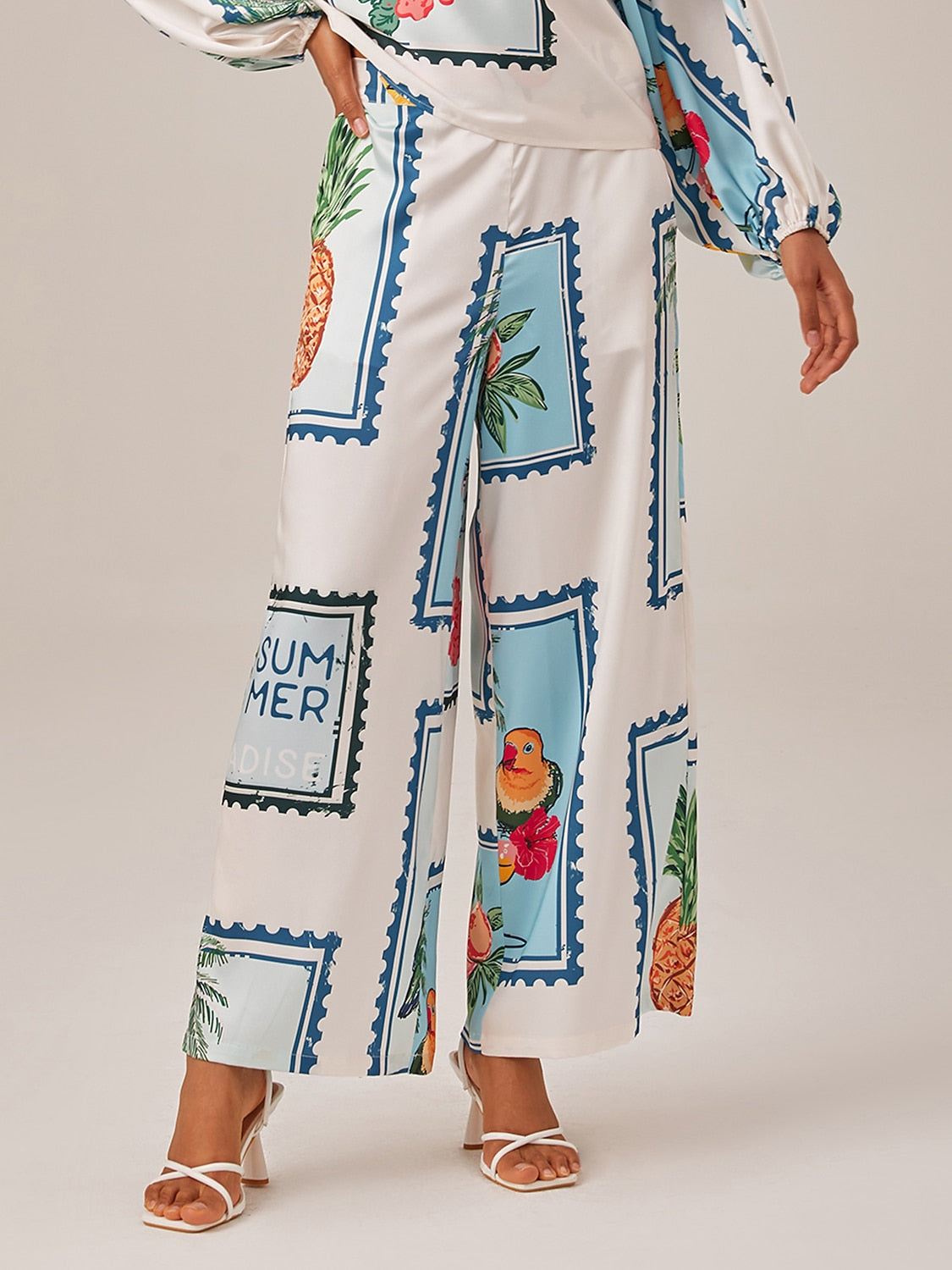 Crafted from glossy satin, these wide-leg pants bring a playful tropical vibe to any outfit. The lively print features postcard-style motifs, including pineapples, birds, and lush greenery, adding a vibrant summer feel. The fluid, wide-leg silhouette offers breezy comfort and elegant movement, making them perfect for vacation, beachside strolls, or chic casual days. A statement piece that pairs effortlessly with simple tops or matching prints.
