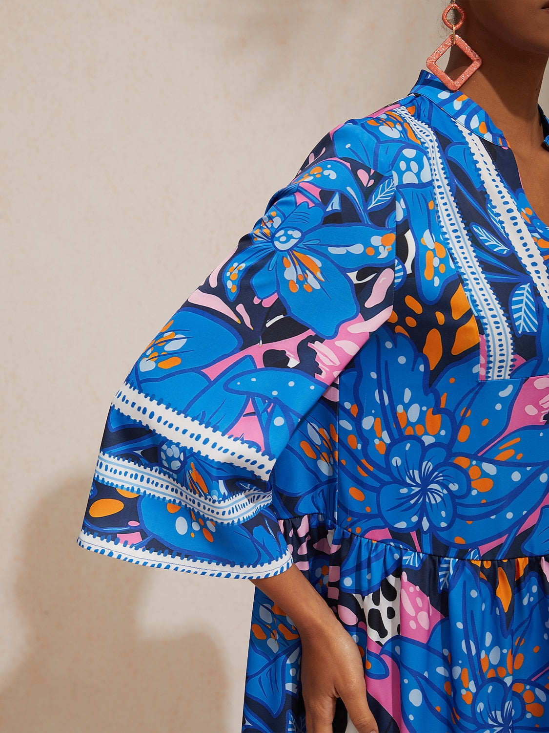 Vacation Contrast Color Artistic Floral Dolman Sleeve Satin Top