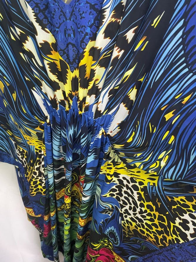 Comfy dolman sleeves, vivid print. Shipped fast, great for beach days.
