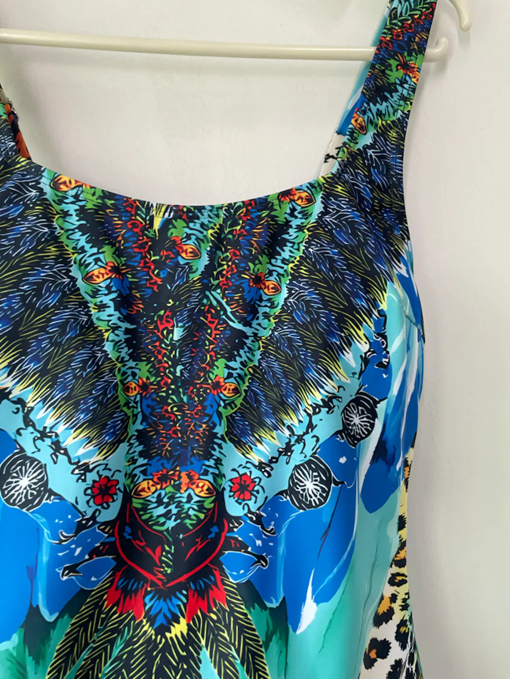 This fitted one-piece swimsuit showcases a chic feather and leopard print design, ideal for a fashionable vacation look, combining comfort, style, and bold patterns for a standout beach appearance.