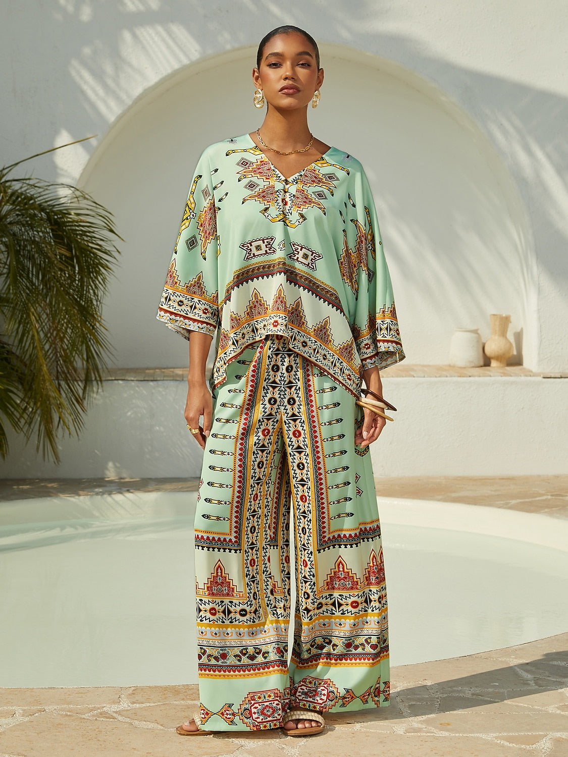 Satin Ocean-Inspired Pattern Print Vacation-Style Set