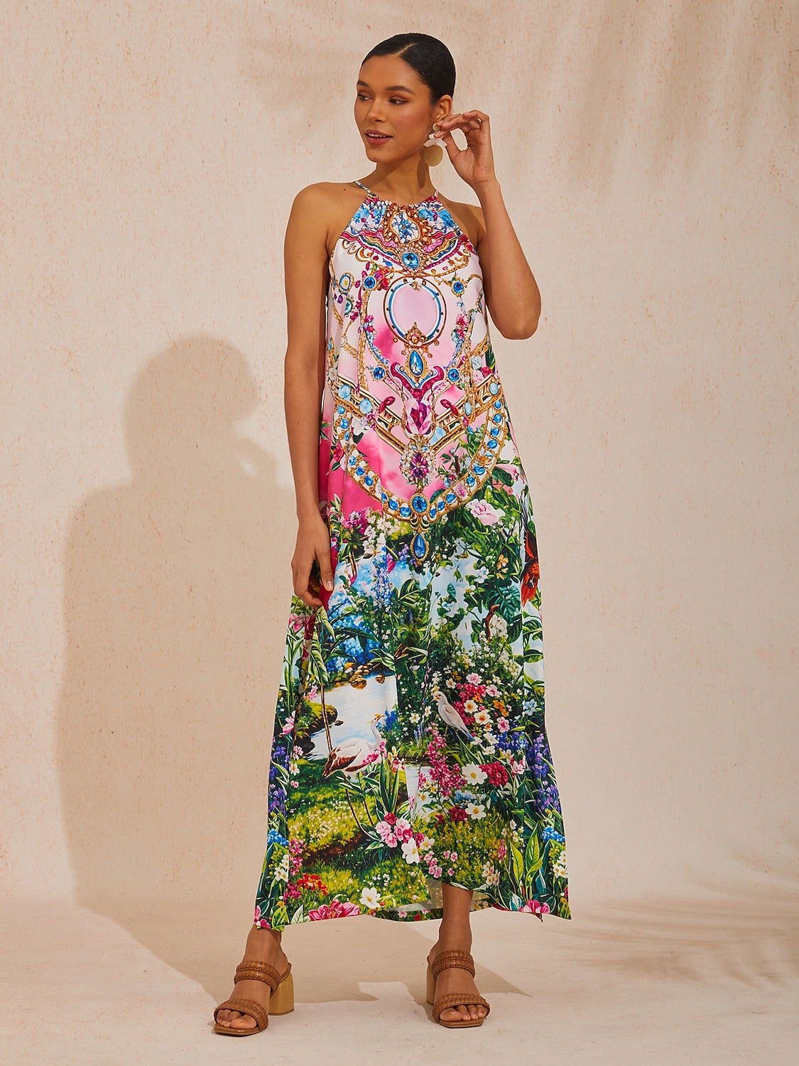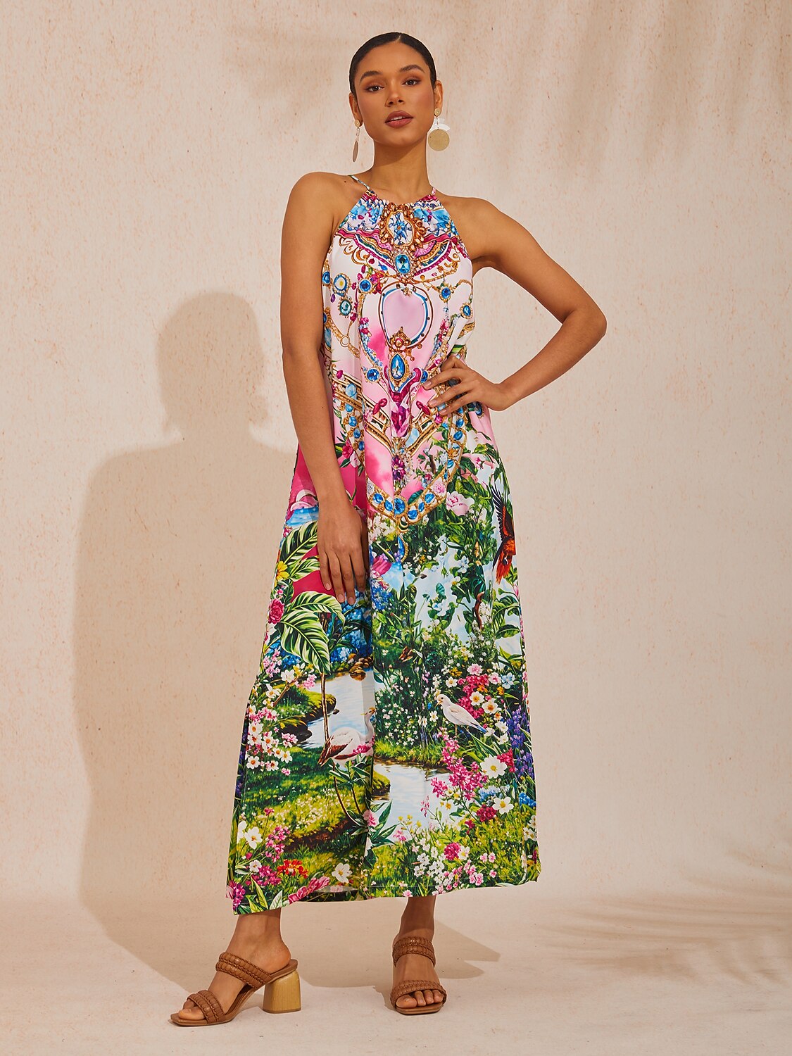 Vacation Jungle Print Sleeveless Loose Satin Maxi Dress