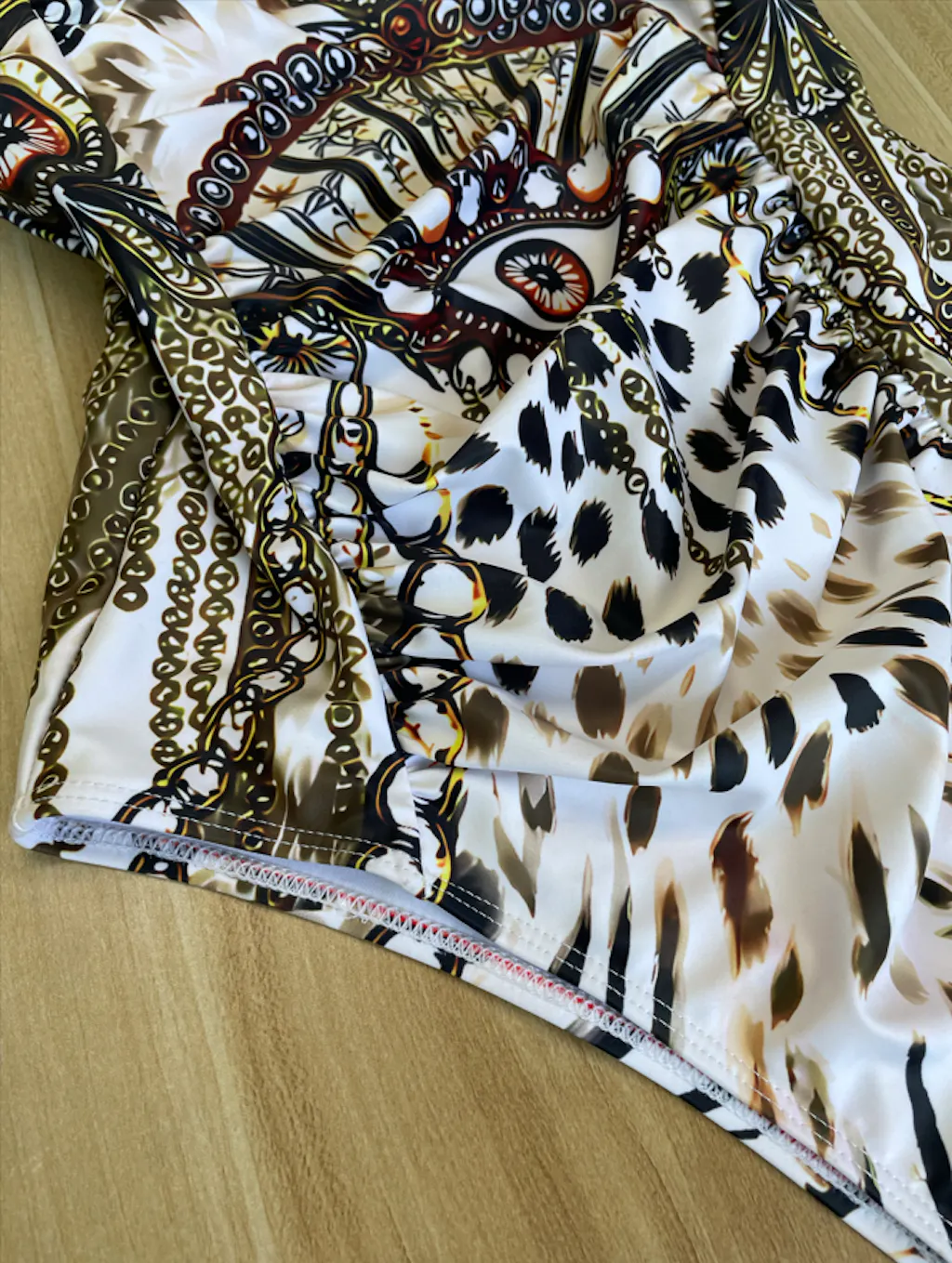 Designed with eye-catching patterns, this swimsuit offers a snug yet comfortable fit, suitable for sunbathing and seaside strolls.