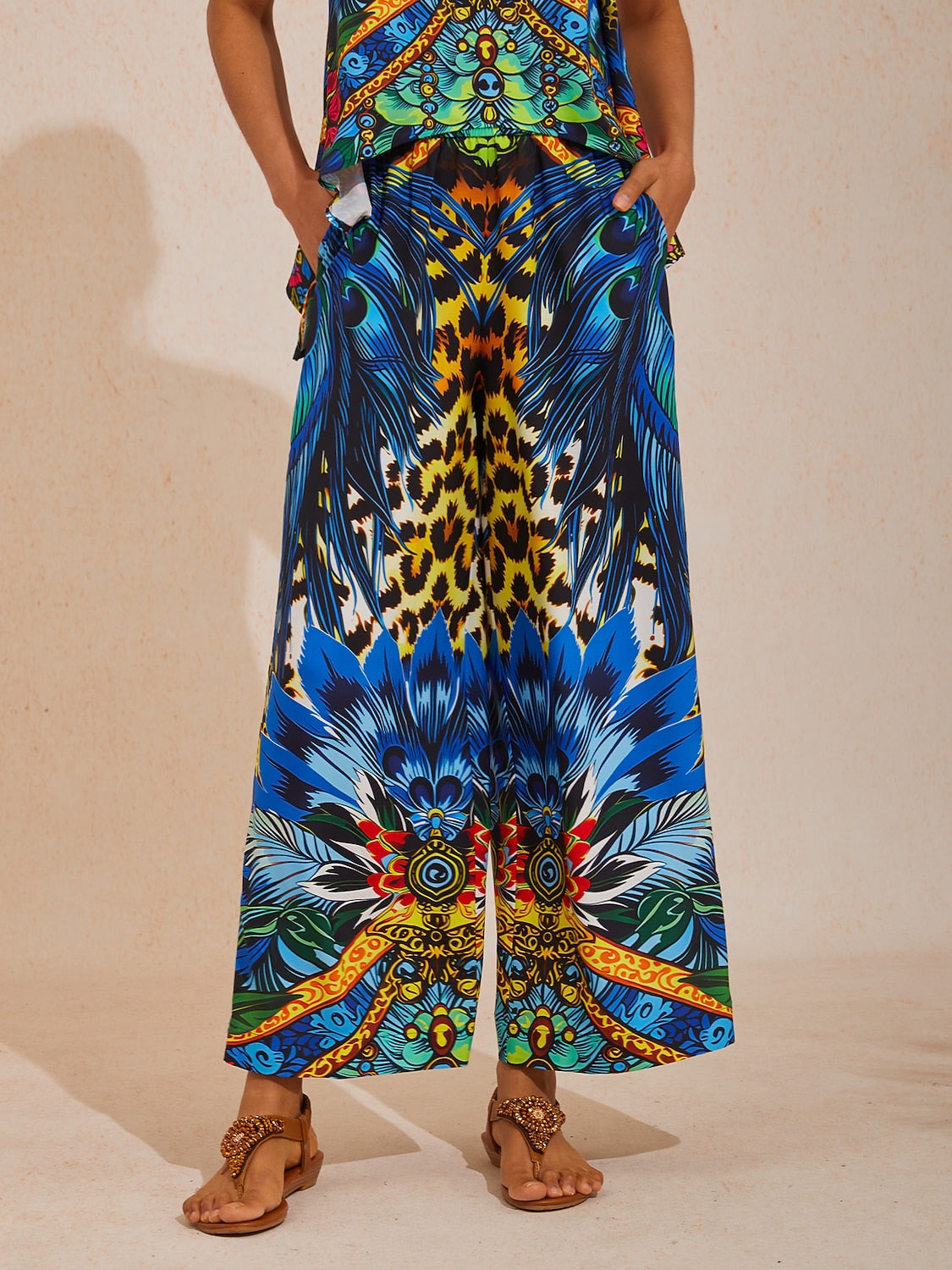 Vacation Leopard Feather Print Elastic Waist Satin Straight Pants
