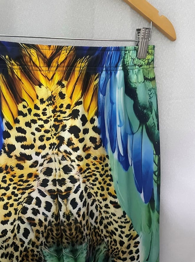 The satin fabric is smooth and has a gorgeous sheen—feels so fancy! The tropical leopard print is bold.