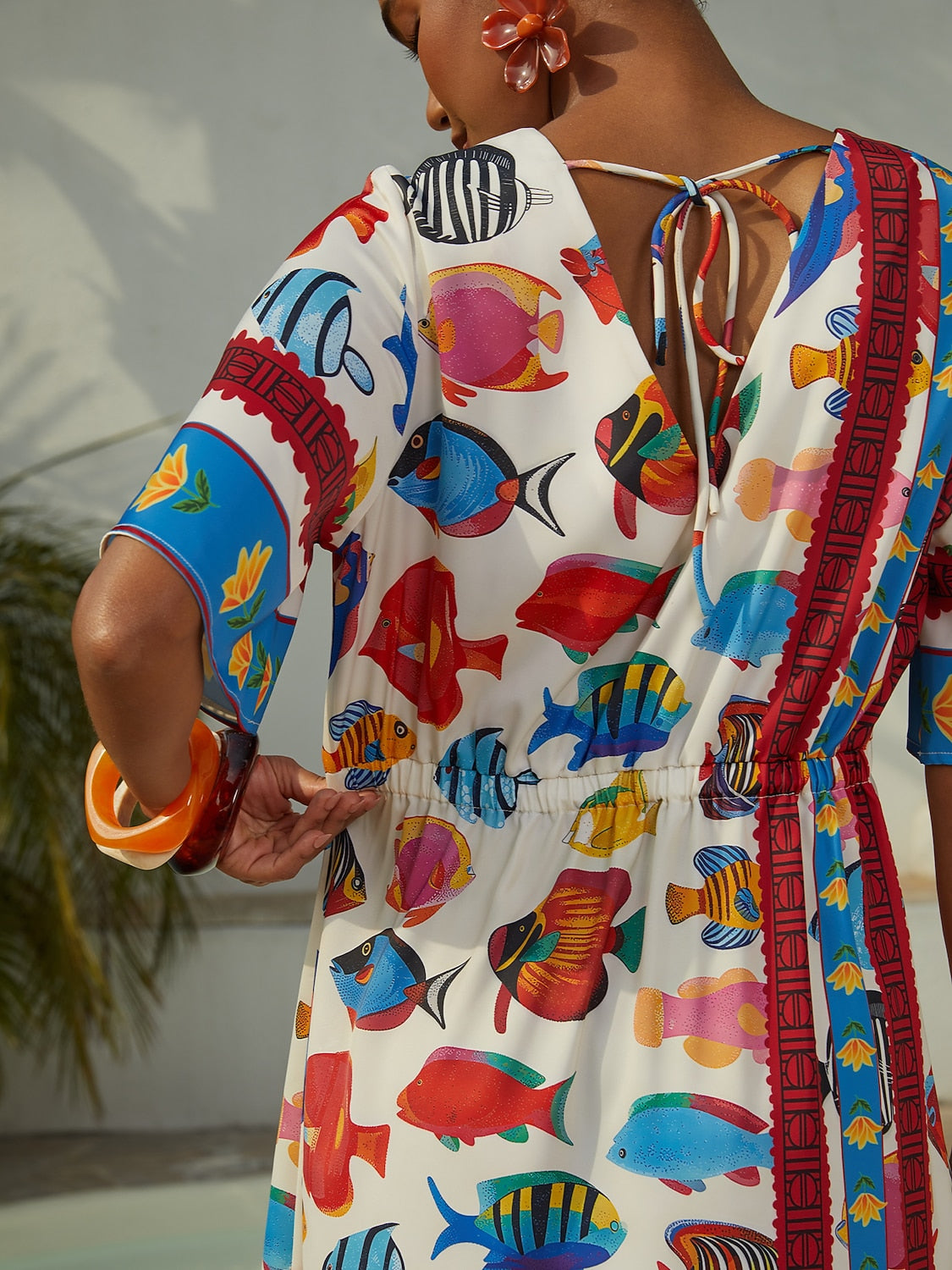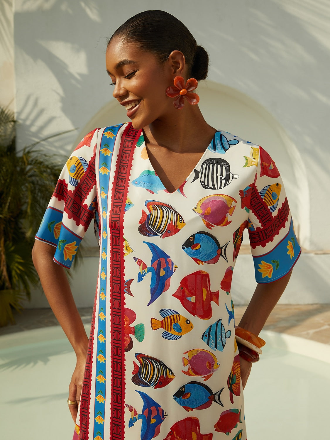 Ocean Elements Print Vacation Style Satin V-Neck Dress