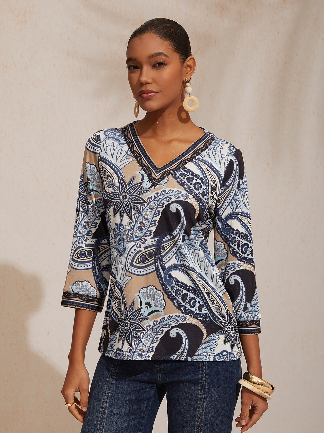 This Vacation Paisley Pattern High Stretch Knit Top features a classic paisley print and a form-fitting, stretchy design, offering both comfort and style—perfect for relaxed vacation days and easy pairing with any bottom.
