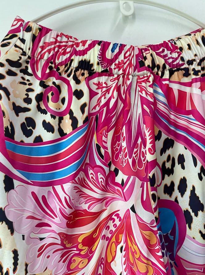 These satin straight pants feature a vibrant pink paisley print, offering a bold yet comfortable style perfect for adding a pop of color and elegance to your vacation wardrobe.