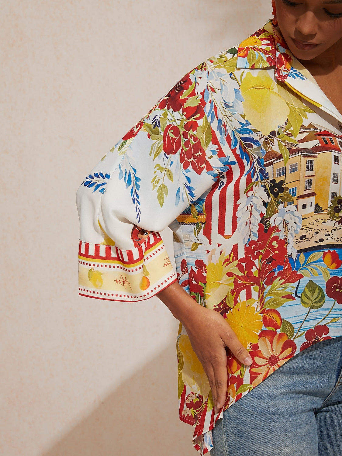 Vacation Scenic Floral Print Dolman Sleeve Chiffon Short Shirt