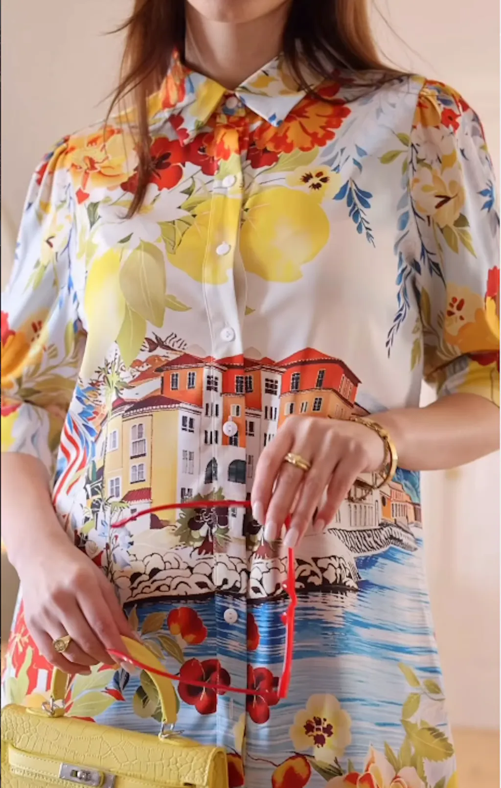 Vacation Scenic Floral Print Straight Satin Shirt Dress