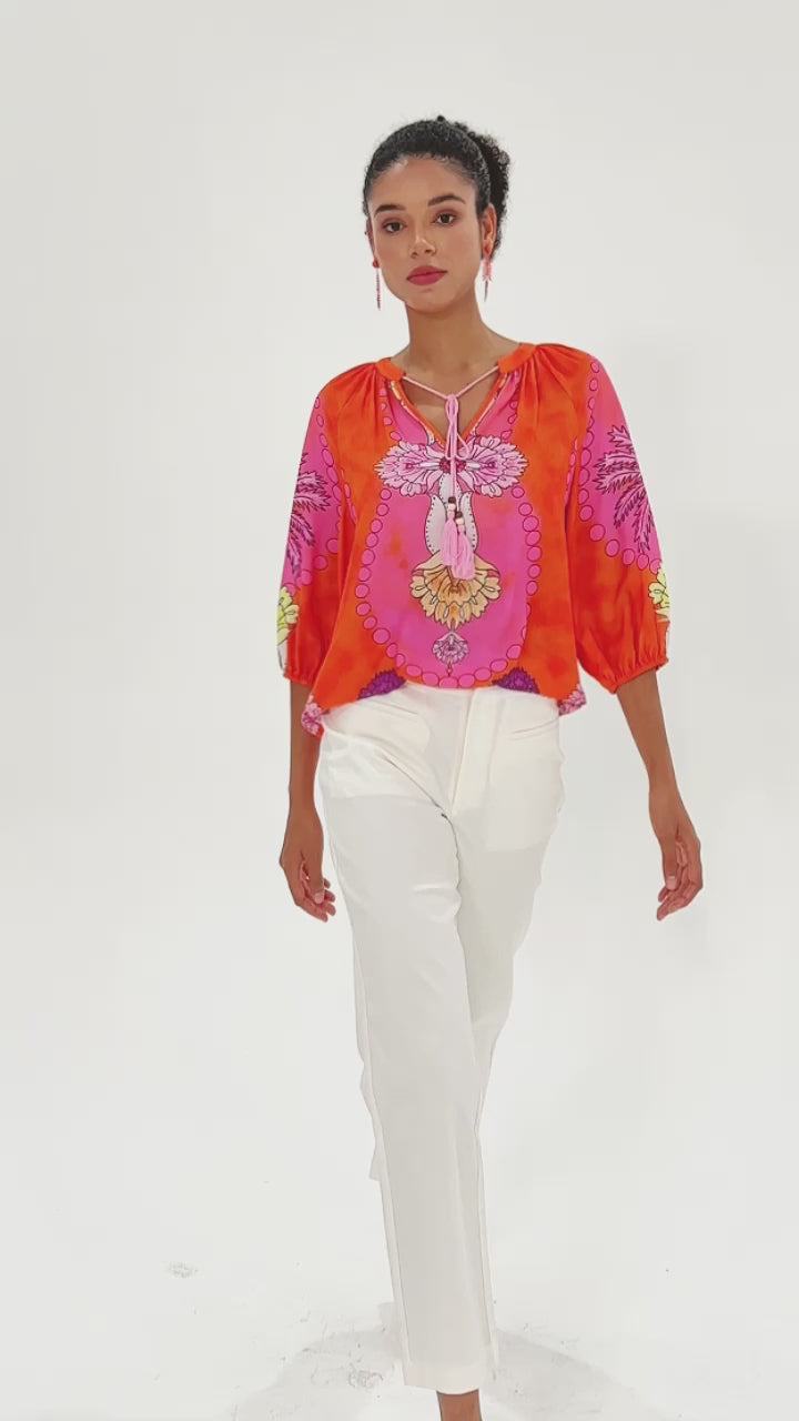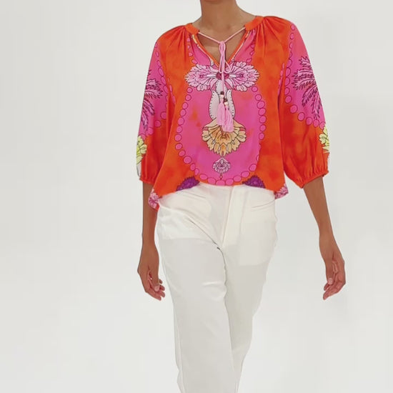 Vacation Contrast Color Artistic Floral Dolman Sleeve Satin Top