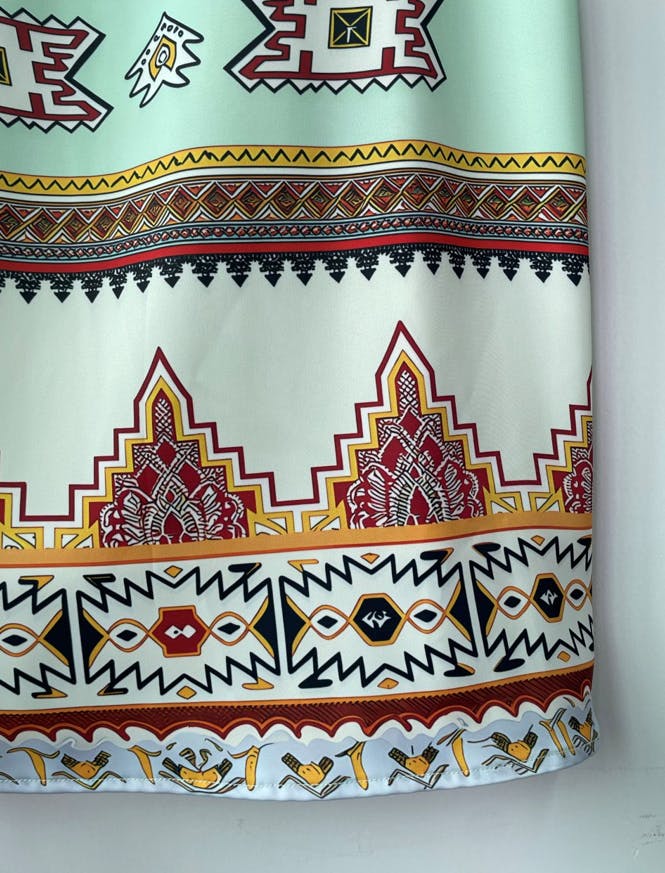 This Vacation Vintage Ethnic Geometric Pattern Satin Midi Dress combines bold, unique patterns with a luxurious satin finish, offering a stylish and comfortable option for your next getaway or summer outing.