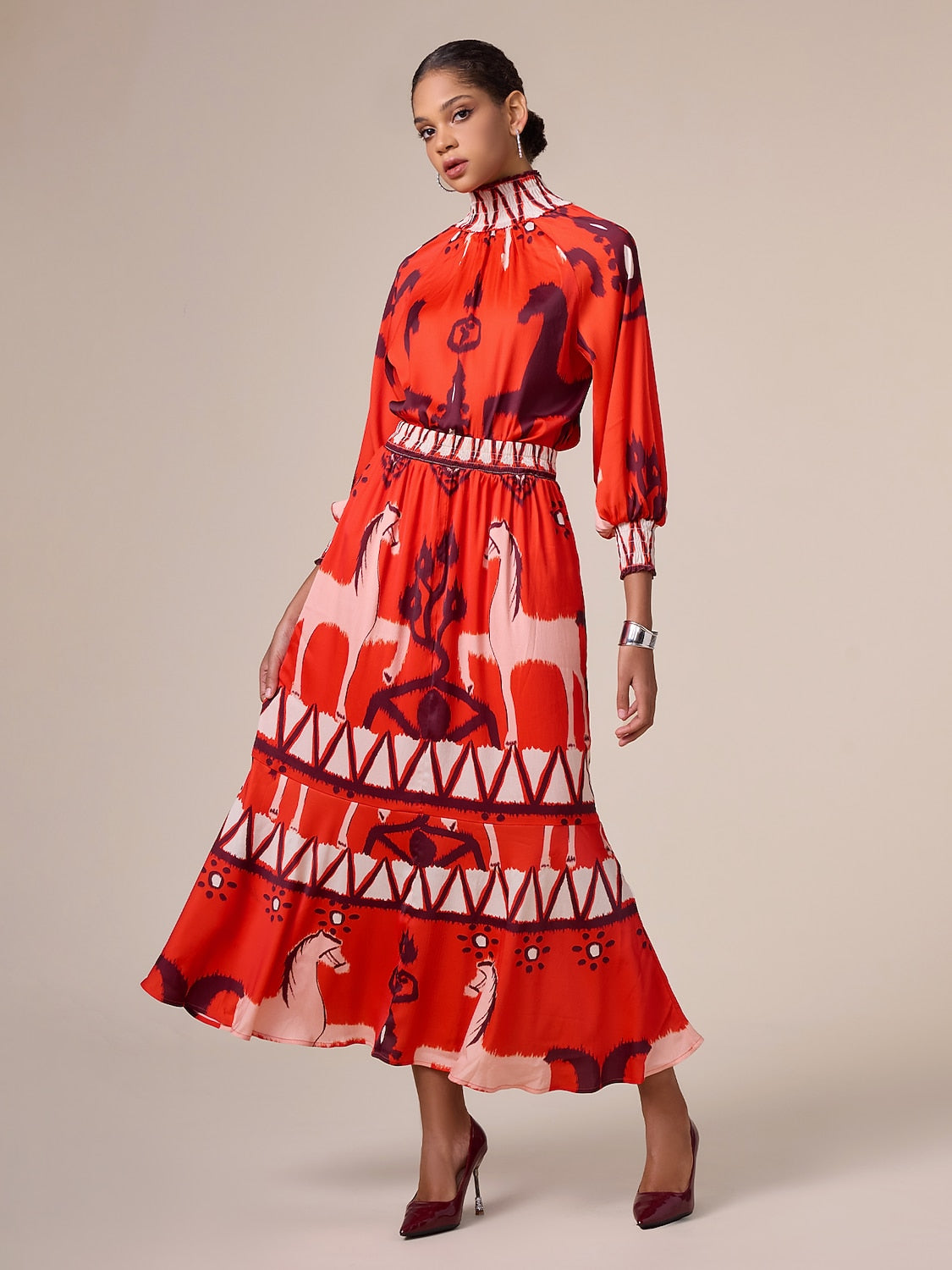 Tencel Linen Orange Red Shirred Wrap Midi Dress